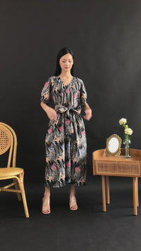 Introducing our new Adelia Karet Midi dress - a stunning blend of sleek elegance and playful style. Featuring a beautiful new design and roomy batik fabric, this dress comes complete with a sash and pockets for added convenience. Plus, the V neck adds a touch of sophistication. Perfect for any occasion!